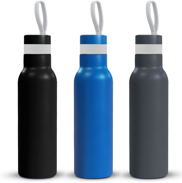 Ø 6,8 x 24,5 cm. Capacidad 500 ml. Acero inoxidable. Botella Vacuum. Interior en acero 304 y exterior en acero 201. Acabado satinado mate. Detalle de agarre siliconado gris.. Mantiene hasta 12 hs la temperatura de las bebidas calientes y 24 hs de las bebidas frías. Presentación en caja de regalo Kraft.
