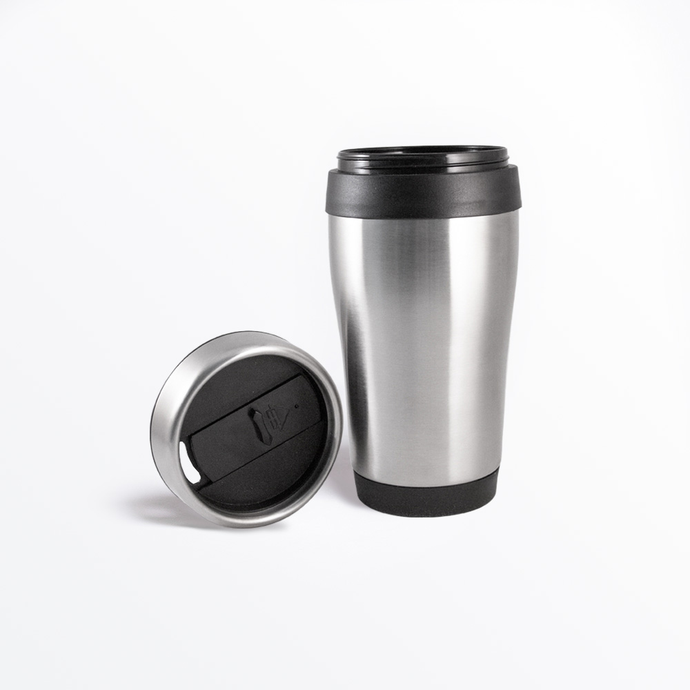 Termo de acero inoxidable y plástico con capacidad de 400 ml. Tapa de rosca.