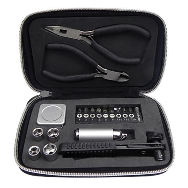 Set de 19 piezas. Incluye : Linterna ; 2 Pinzas ; Juego de 10 puntas ; Cinta Métrica ; 4 Dados y Manguillo