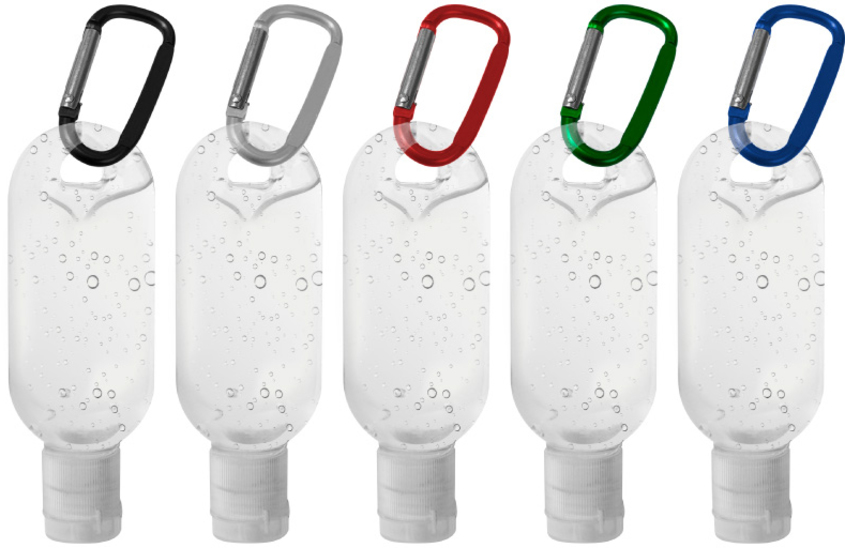 11,5 x 4,5 cm. Plástico. Alcohol en gel en botella transparente con tapa y gancho carabinero de color. Fácil de usar: aplicar sobre manos, antebrazos o cualquier parte de la piel y luego frotar. Seca rápido y deja una sensación suave. Incluye etiqueta de especificaciones pegada de un lado.