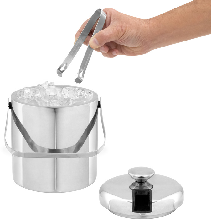 Ø 14 x 14 cm. Capacidad 1100 ml. Acero inoxidable. Interior en acero 304 y exterior en acero 201. Hielera de mesa con tapa. Pinza para hielo de acero inoxidable, encastrable en la misma tapa. Asa de acero inoxidable para transportar. Presentación en caja de regalo kraft.