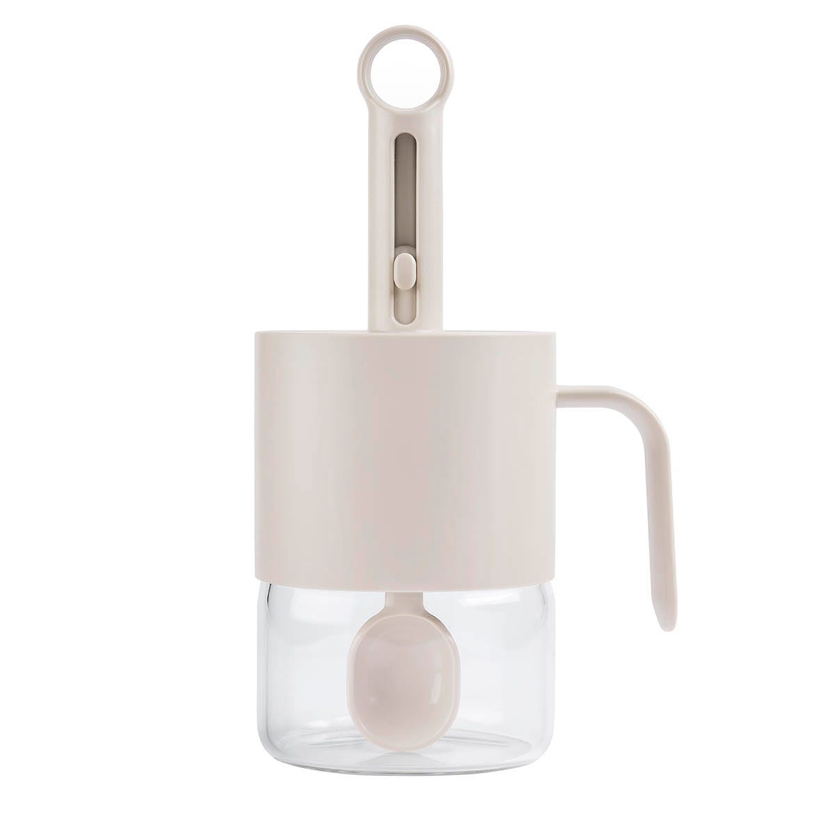 Frasco de vidrio para azúcar u otras especias. Incluye una tapa innovadora con cierre a presión que integra una cuchara retráctil, haciendo que servir y medir sea más sencillo que nunca. Su diseño con rosca permite desprender el frasco de vidrio fácilmente, ayudando así a una mejor limpieza. Incluye caja individual.