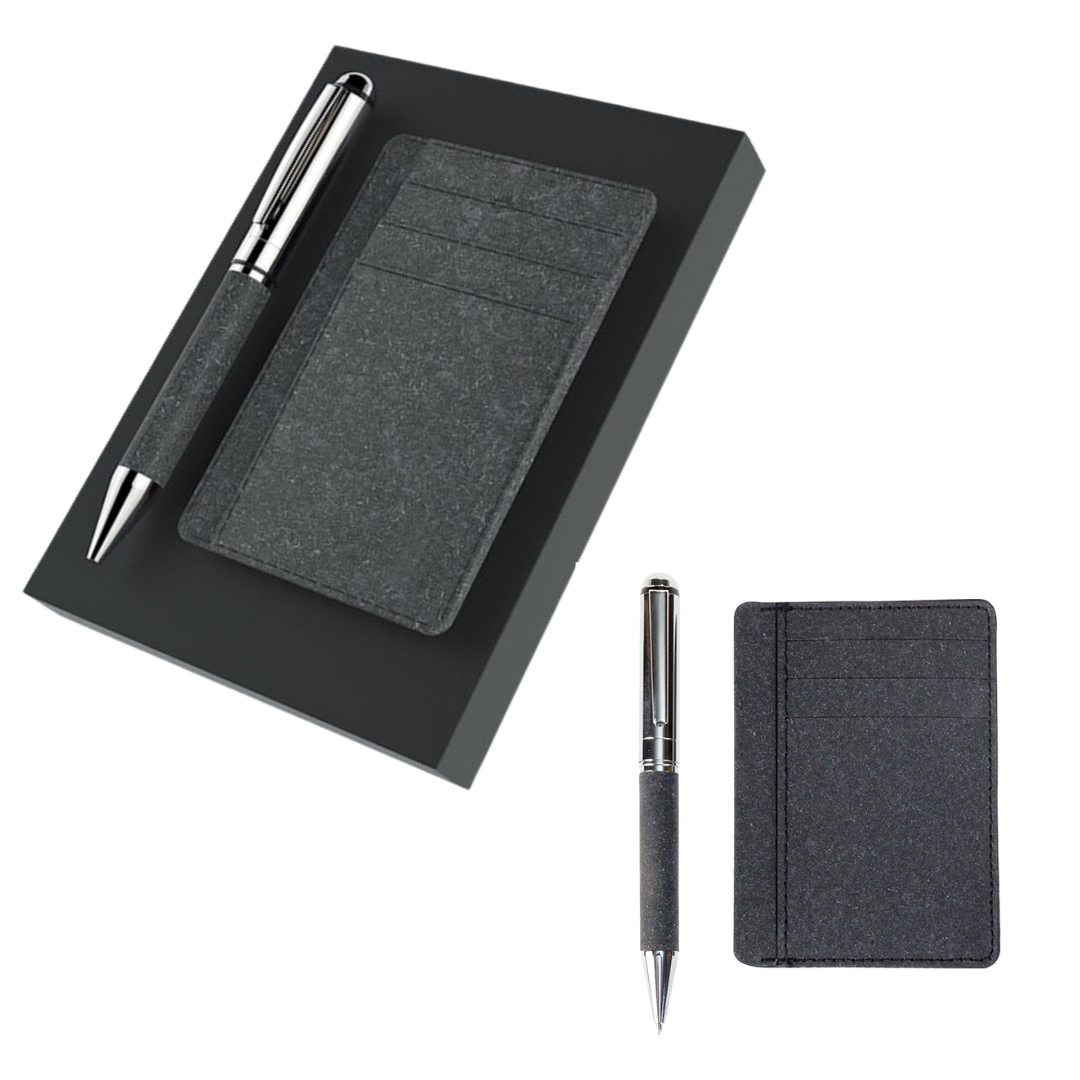 Set Bolígrafo metálico con grip en PU reciclado Portatarjetero con 4 compartimentos Caja de presentación.