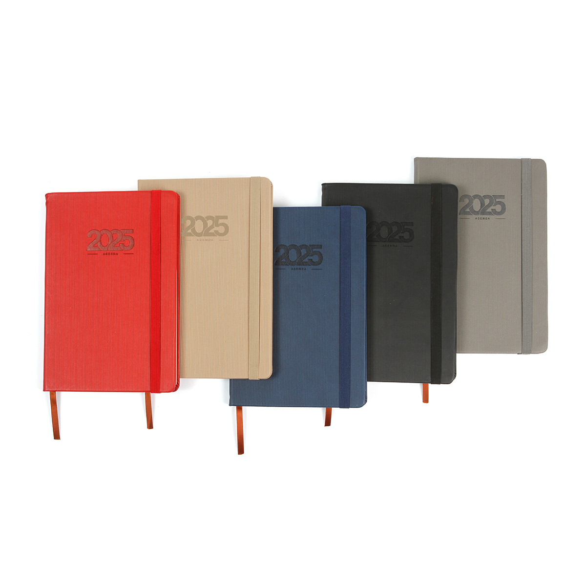 Set de Agenda semanal 2025 con pluma y caja de regalo. Cubierta fabricada en curpiel (PU) con resorte sujetador e interior con 80 hojas de 65 g. Cada semana tiene espacio para tareas importantes y está organizada por horario (5:00 am – 22:00 pm). Cuenta con: Separador de hojas, Calendario anual 2024-2026, planeador mensual, hoja de objetivos anuales, hoja de pendientes mensuales, espacio para notas, tareas, sección de contactos y bolsillo interno para almacenar documentos. Incluye caja de cartón individual y bolígrafo con tinta de escritura negra.