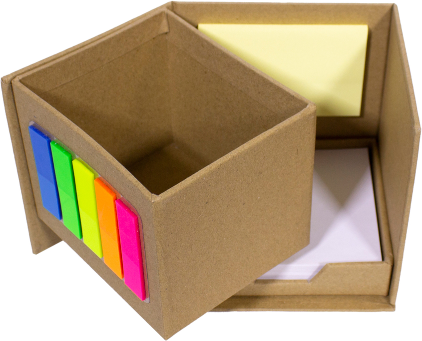 10 x 10 x 10 cm. Cartón. Porta Lápiz con post-it de tiras de diferentes colores flúo en el frente. Empujando hacia adelante, encuentras bloc rectangular con autoadhesivos de color amarillo y en la parte inferior un contenedor con hojas blancas de 7,4 x 8,7 cm. Producto Reciclable.