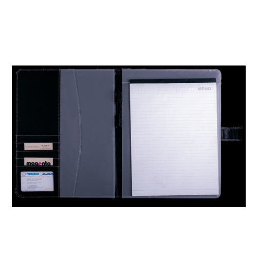 Carpeta de curpiel tamaño carta con block de rayas, compartimiento de tarjetas, porta bolígrafo y cierre magnético.