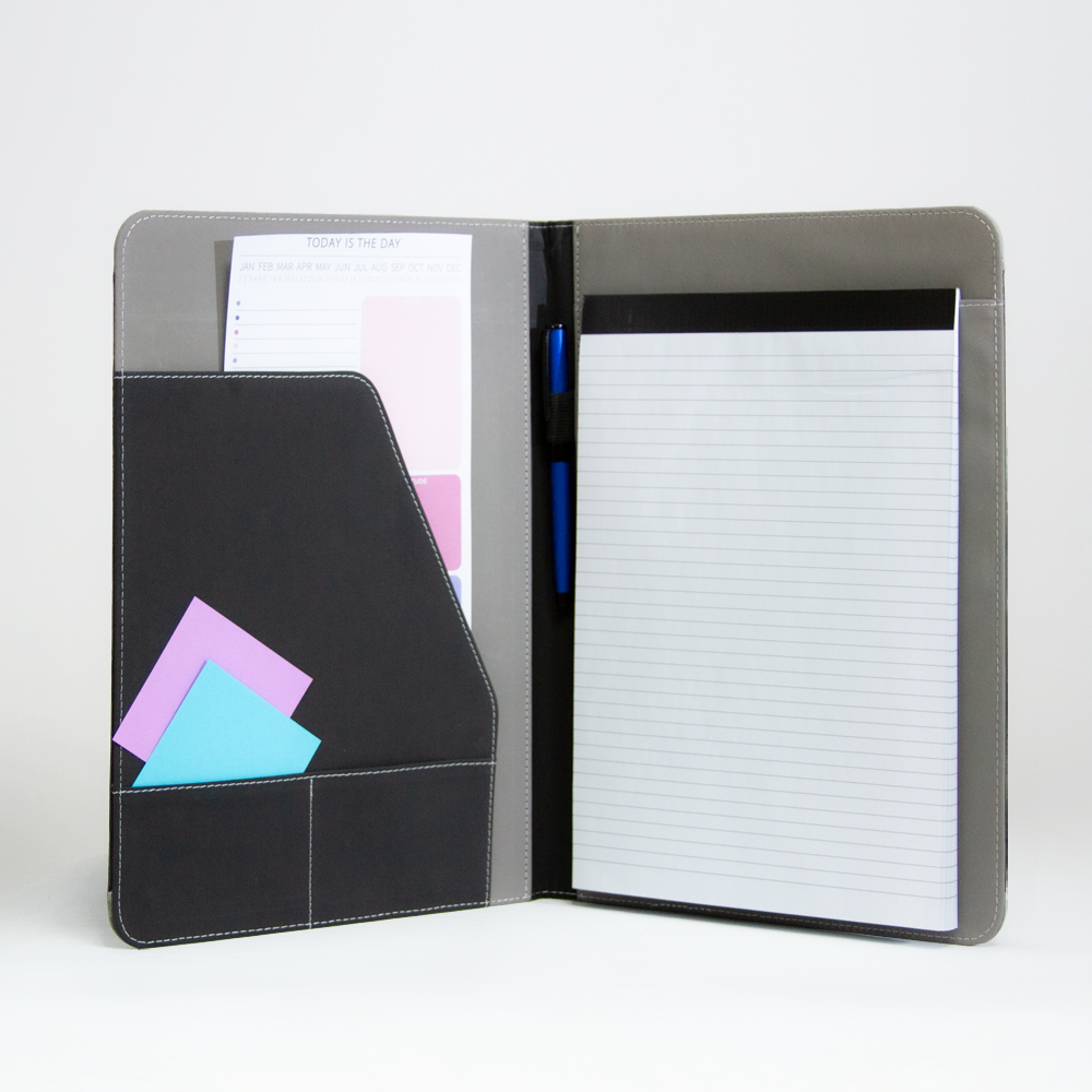 Carpeta con cubierta de PU, compartimentos para tarjetas y bolígrafo. Bloc de 30 hojas rayadas.