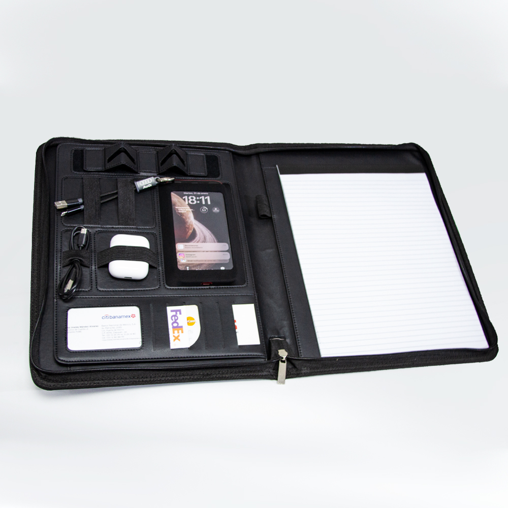 Carpeta con cubierta exterior de poliéster 300D e interior de PU. Placa metálica para grabado y cierre. Compartimentos para tarjetas, sujetador de bolígrafo bolígrafo, porta celular. Cintas elásticas para sujetar diversos artículos y soporte con velcro para tablet o celular. Bloc A4 con 20 hojas rayadas.