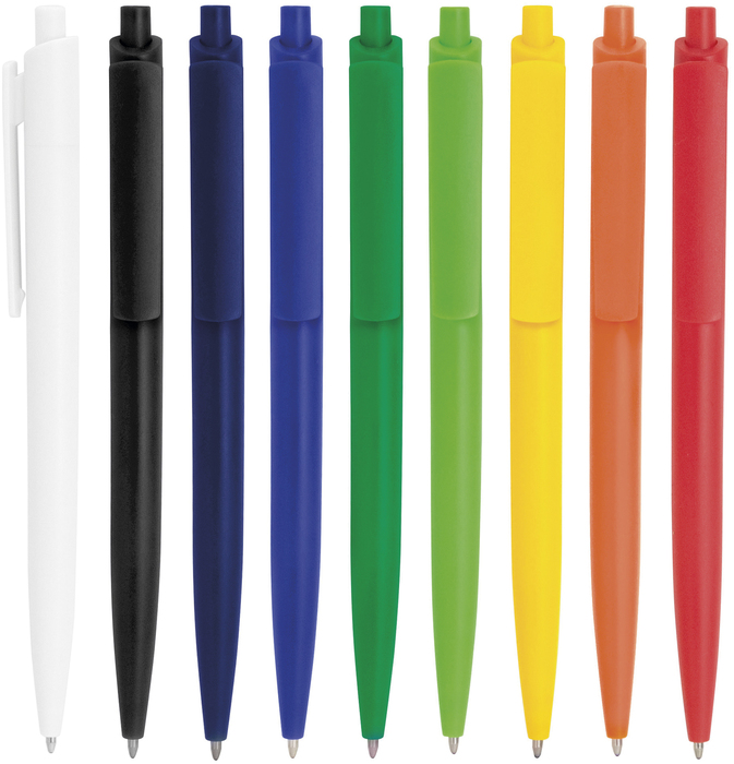 Plástico ABS. Boligrafo retráctil. Cuerpo de diferentes colores. Acabado mate. Pulsador, clip y puntera del mismo color del cuerpo. Tinta negra. Amplia área de impresión.