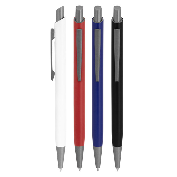 Aluminio, ABS, Acero. Boligrafo retráctil. Cuerpo revestido en laca de diferentes colores. Acabado mate. Pulsador, clip y puntera de color gris gun metal. Tinta negra. Amplia área de impresión.