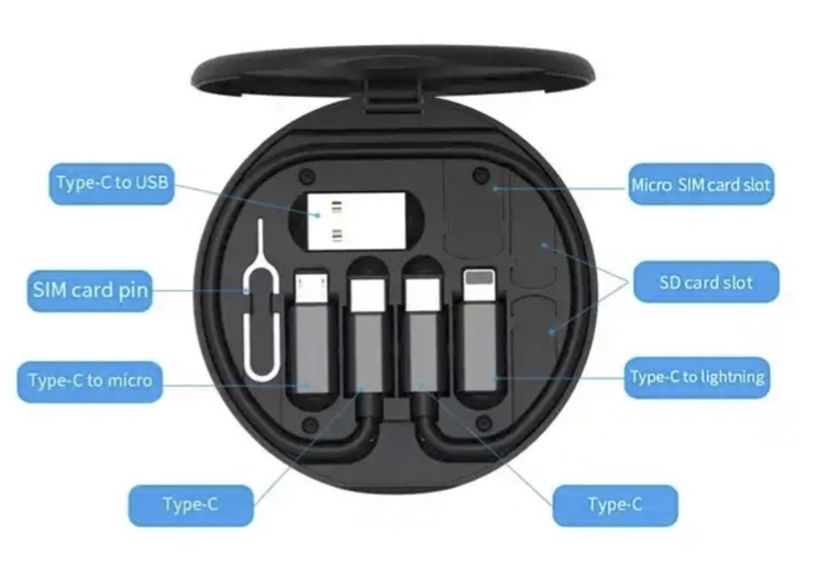 Compacto y portatil estuche de conectores. Incluye: 1.- Cable tipo C a C de 28 cm largo: 20v/3A 60 W Max 2.- USB lighting: 5v/2.4A Max 3.- USB micro 4.- USB C: 3A output 5.- Horquilla para tarjetas SIM 6.- Cavidad estandar para tarjeta SIM y SD 7.- Funcion para sostener telefono mobil.