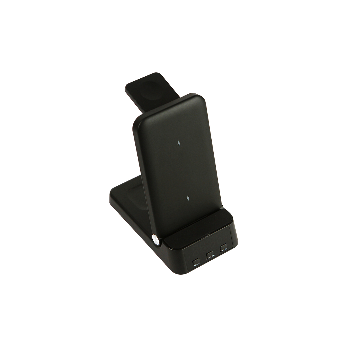 Cargador inalámbrico multifunción con reloj. Cuenta con zonas de carga para teléfono celular, reloj inteligente y audífonos inalámbricos. Potencia máxima de 15W. Incluye función de reloj despertador.